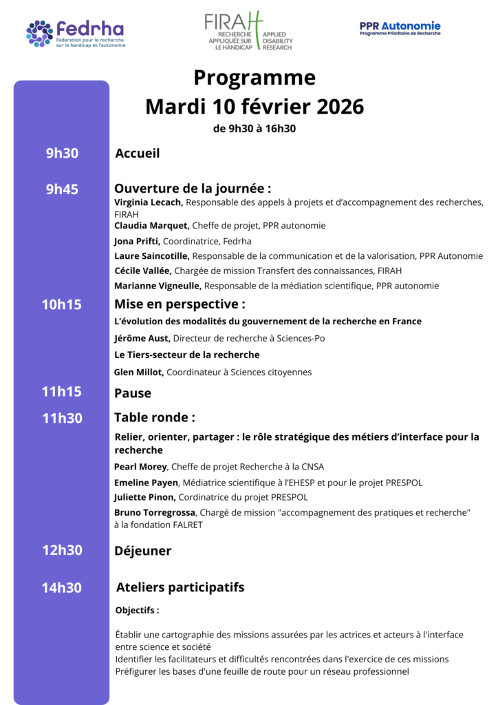 Cette journée s’adresse à toutes celles et ceux qui, dans leurs pratiques, contribuent à créer des liens entre science et société sur les thématiques du handicap et vieillissement : coordination de projets, médiation, pilotage, soutien, prospective, valorisation, etc.